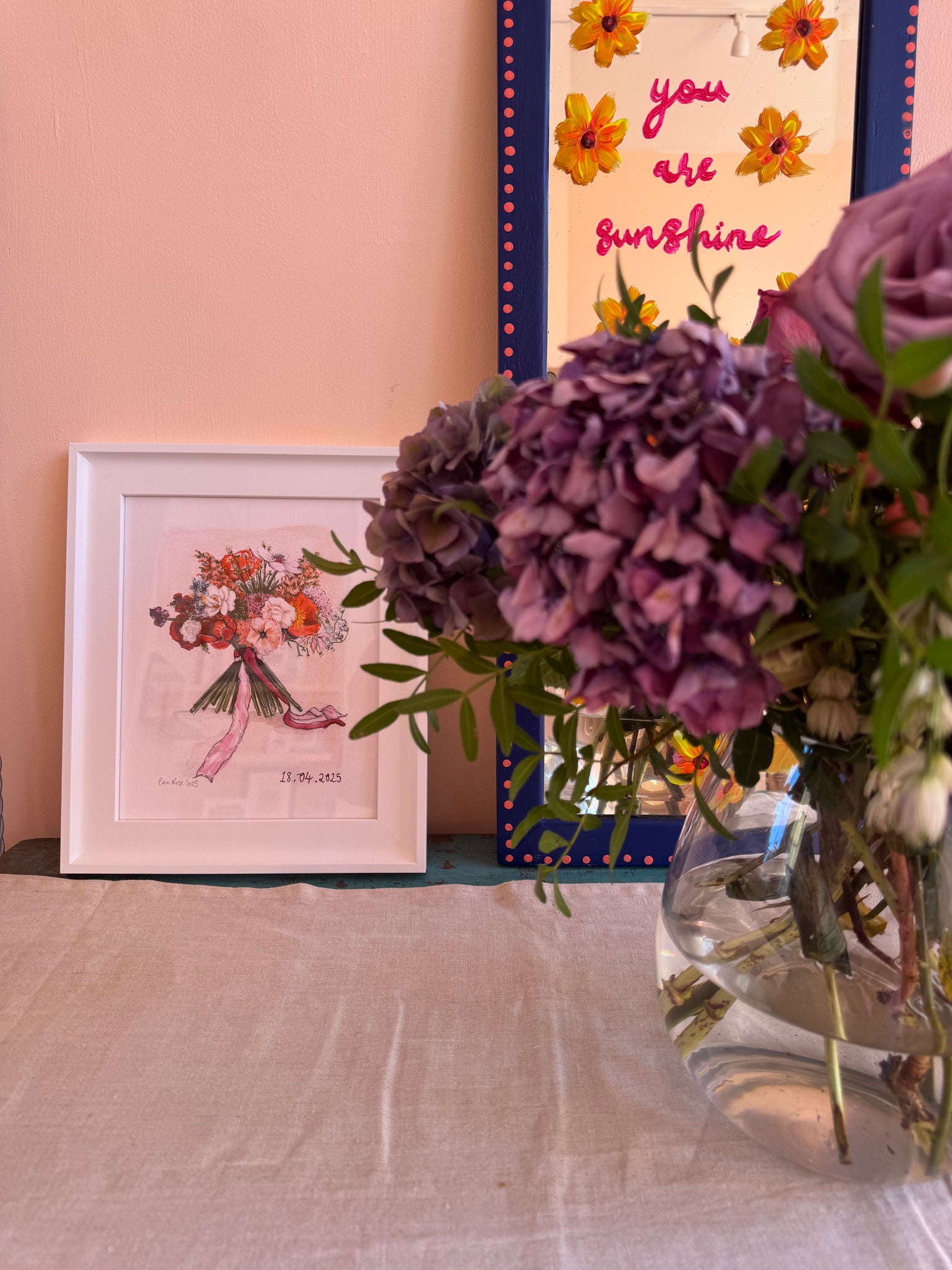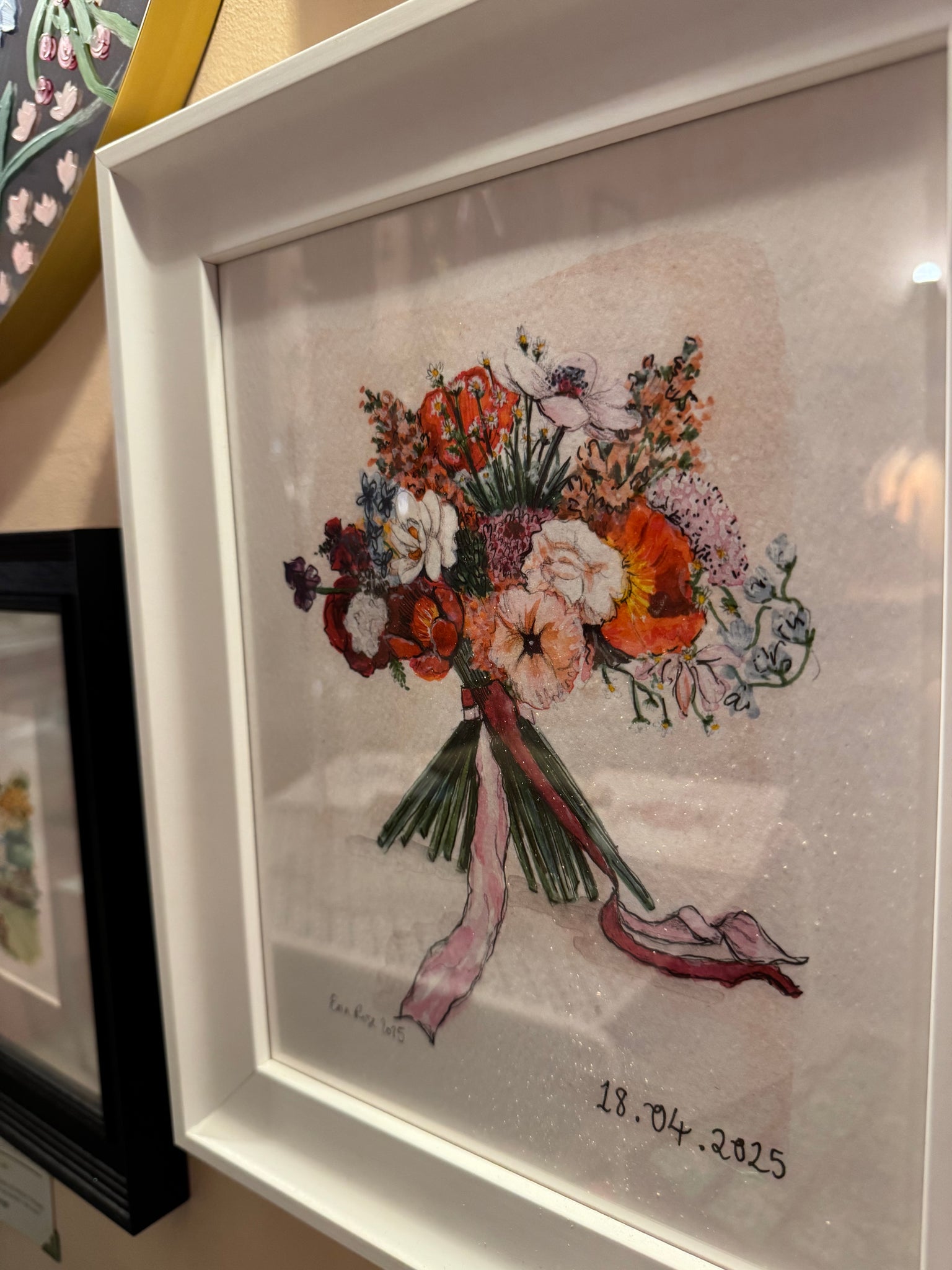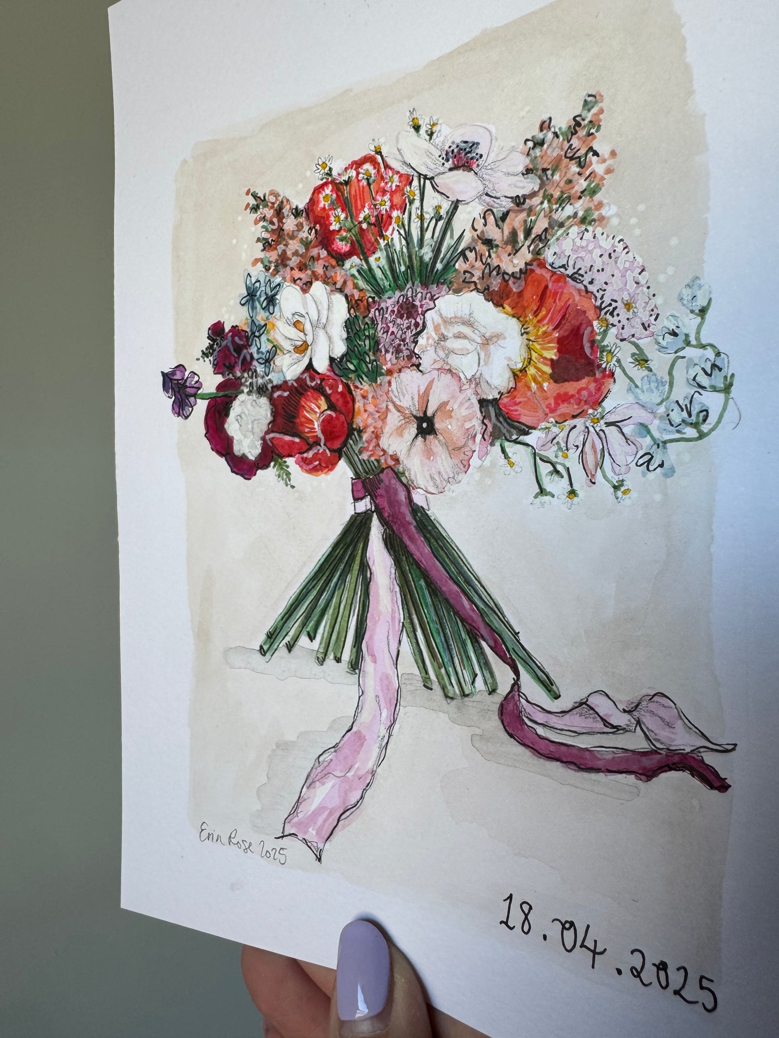 A hand painted keepsake of your treasured flowers, using coloured inks and watercolours. The perfect way to keep them alive long after the big day has ended.