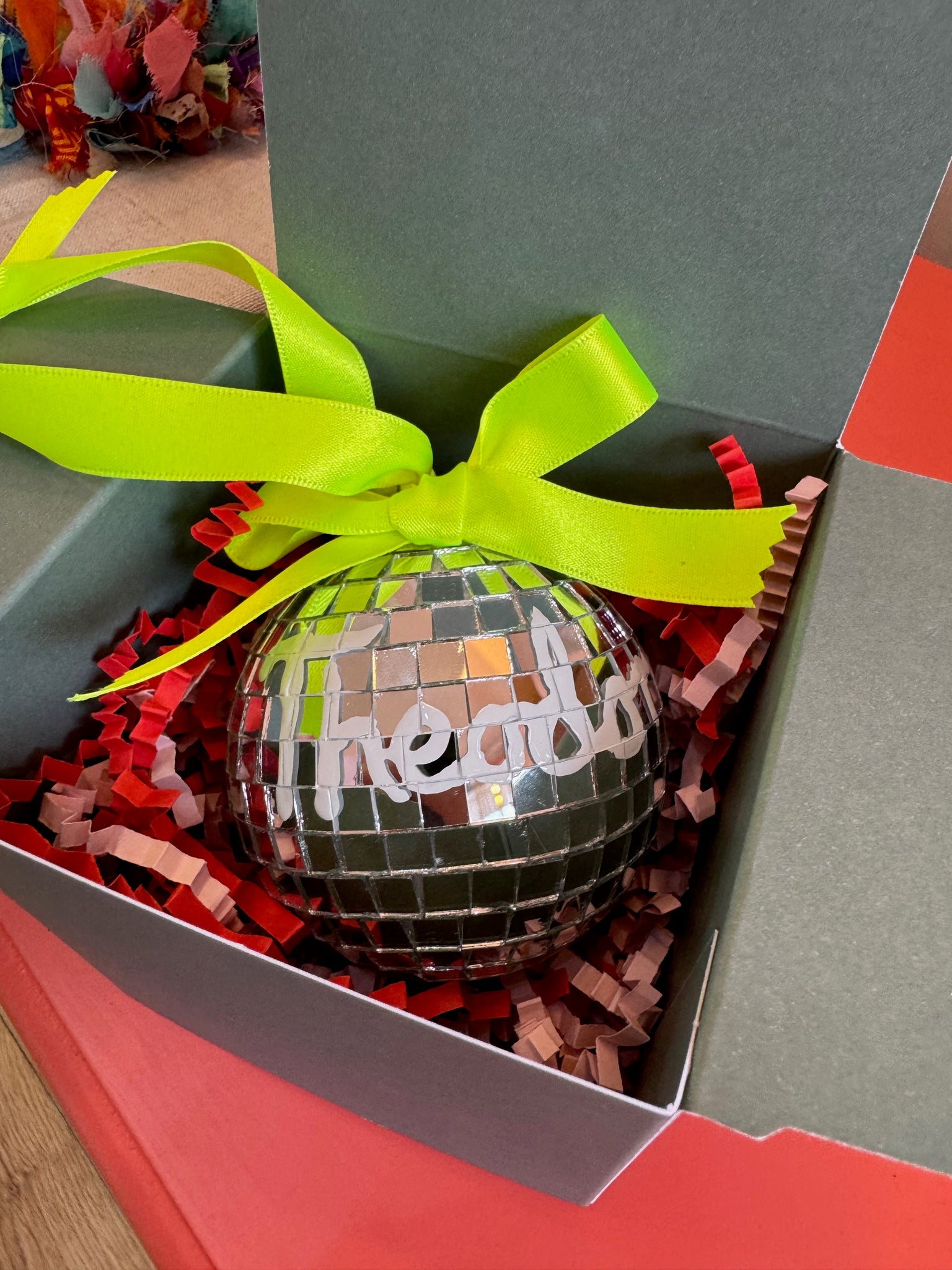 Glitter Ball hanging from a neon ribbon, and featuring a hand-painted enamel name