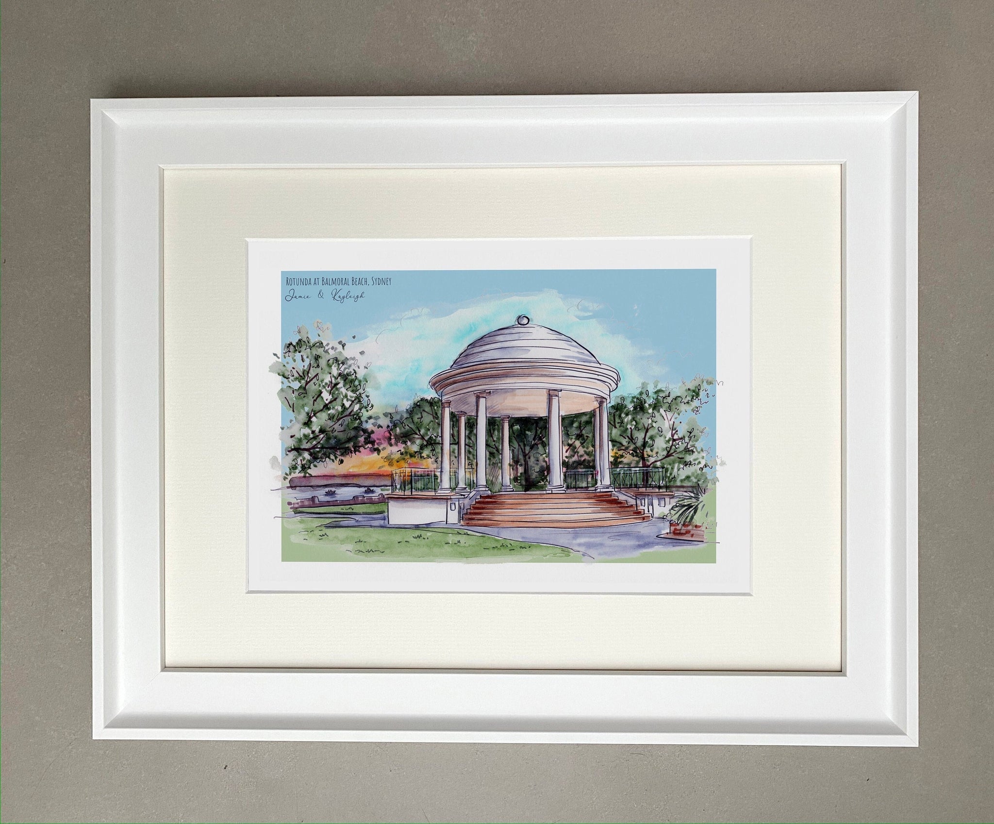 This illustration of The Rotunda at Balmoral in Sydney, Australia, was lovingly hand drawn and painted with inks and watercolours, then made into a high quality Giclee print which can be personalised with names or wording (or a date) of your choice.