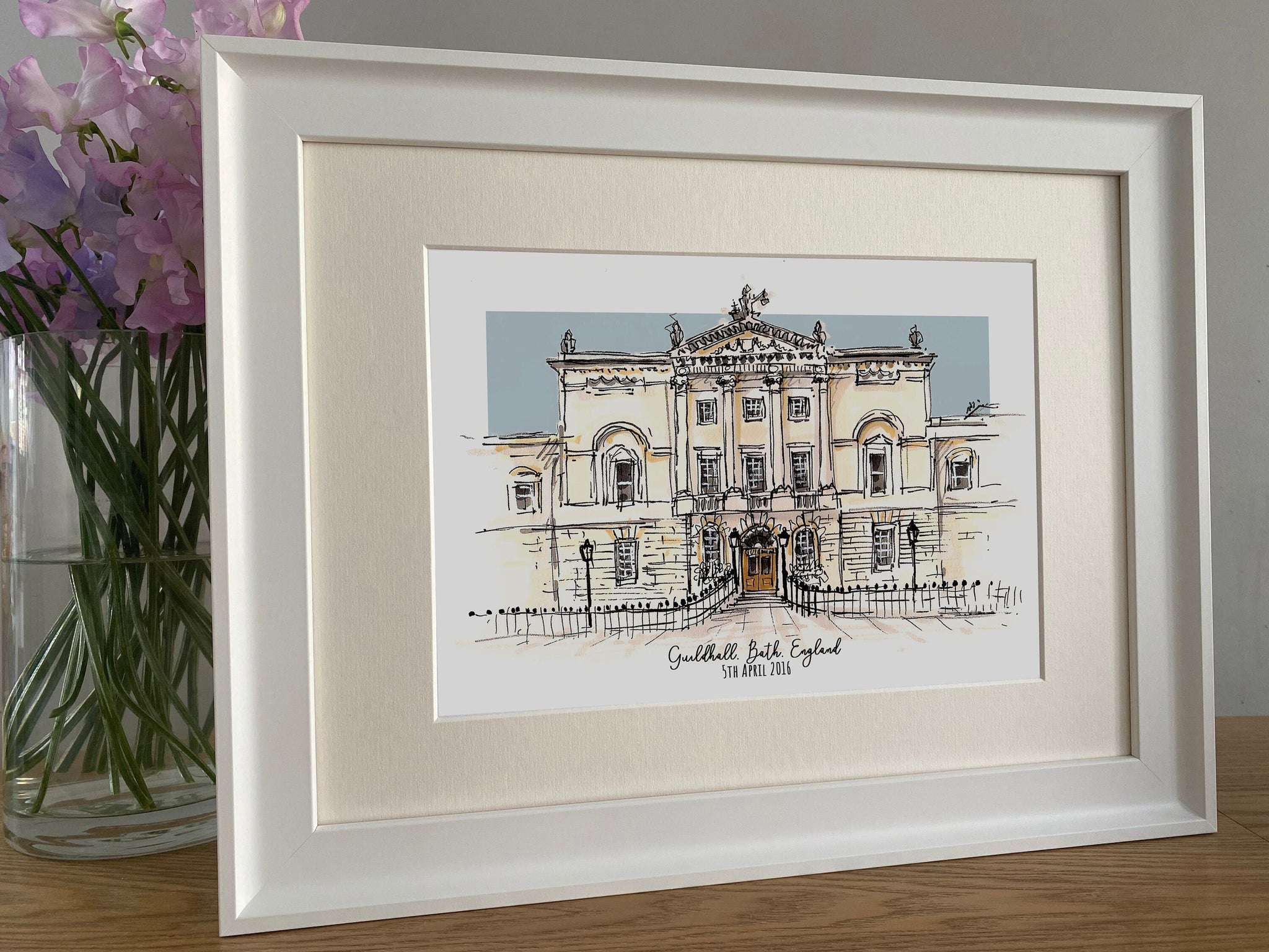 This Guildhall Bath, England high-quality Giclee print, was created from an original hand-drawn illustration using watercolours and inks.