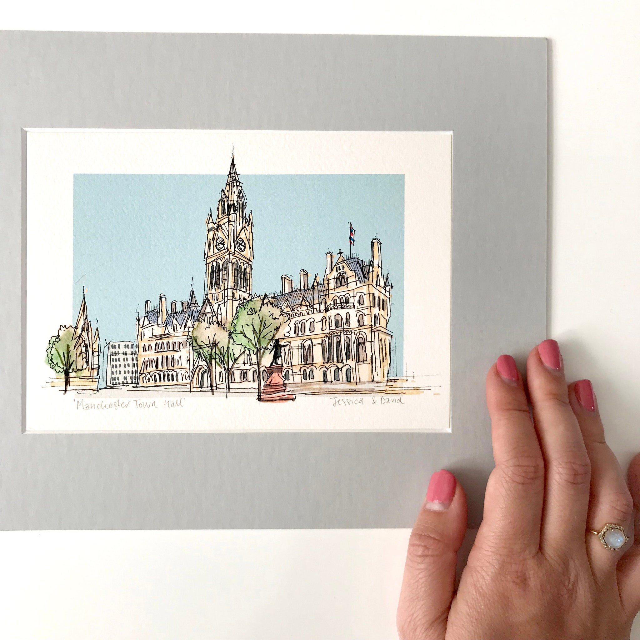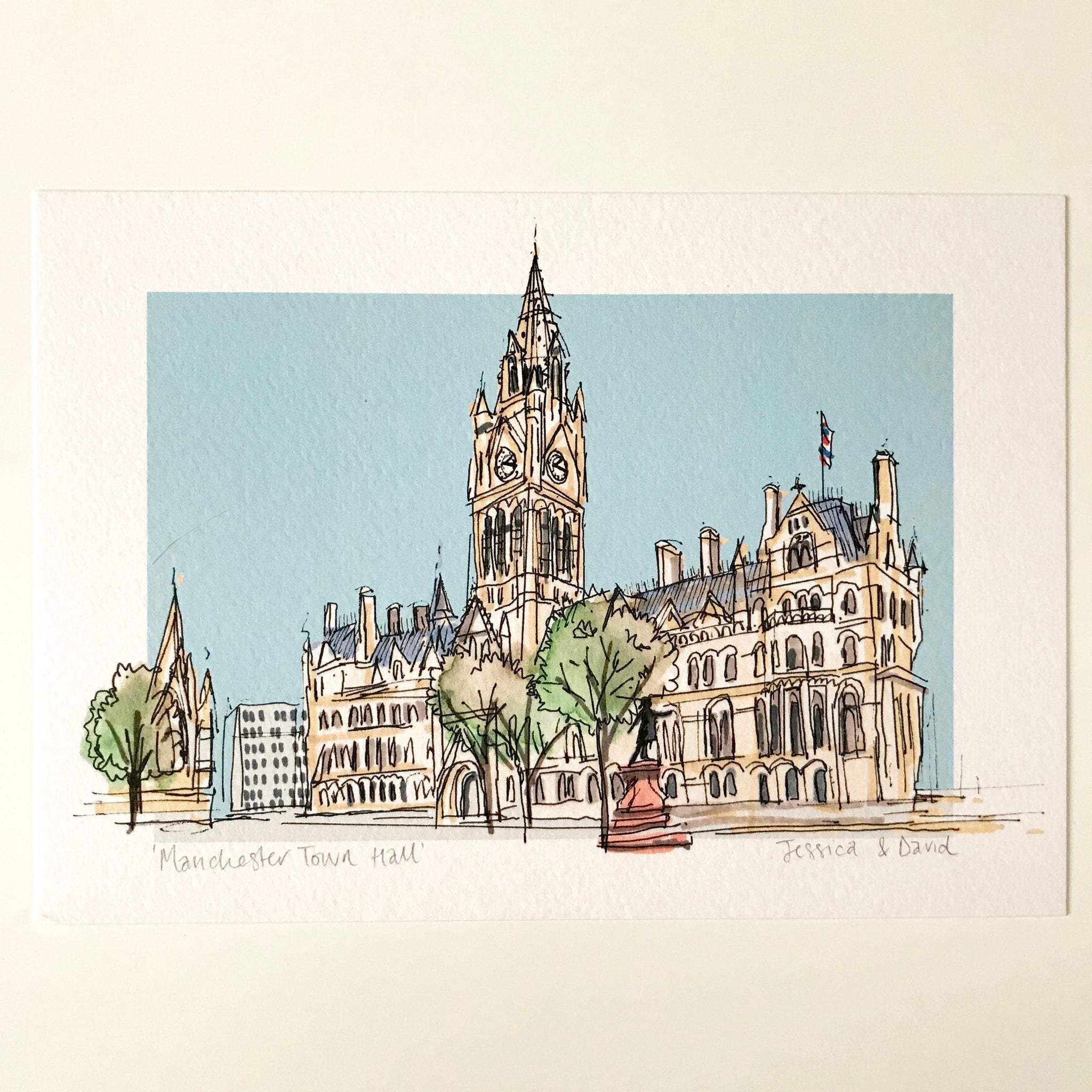 A gorgeous Giclee print which has been created from an original hand-drawn illustration of Manchester Town Hall, England. Originally created using watercolours and fine-liner inks. This piece is made to order and is printed on to beautifully textured 300gsm paper stock for a high-quality finish.