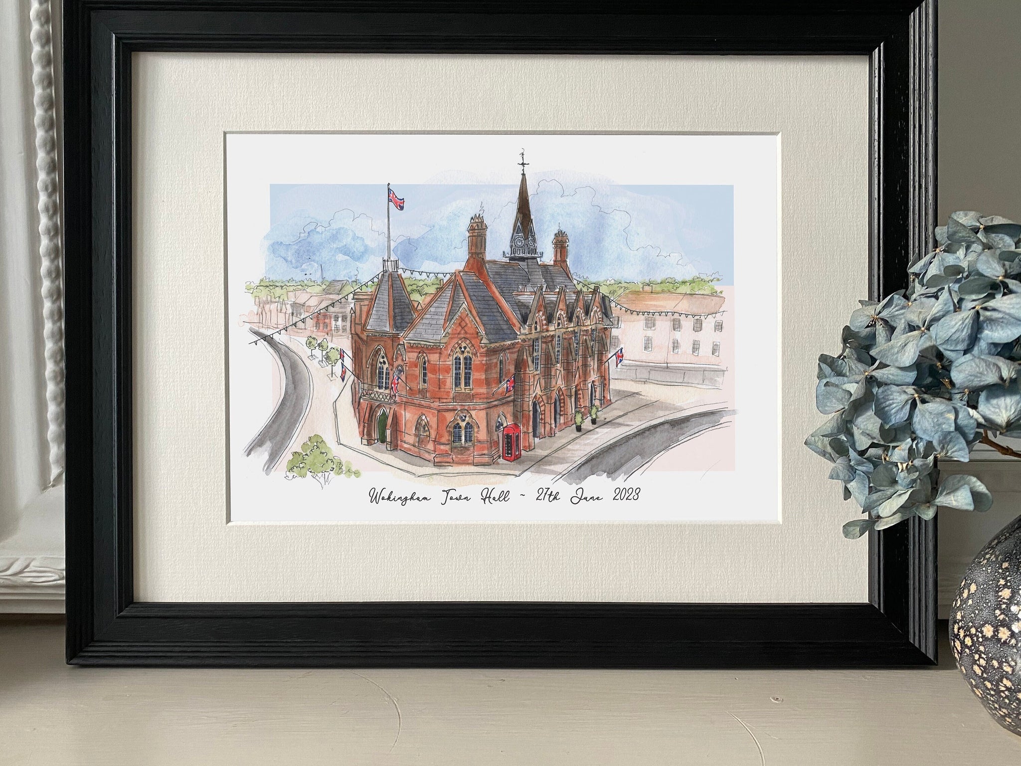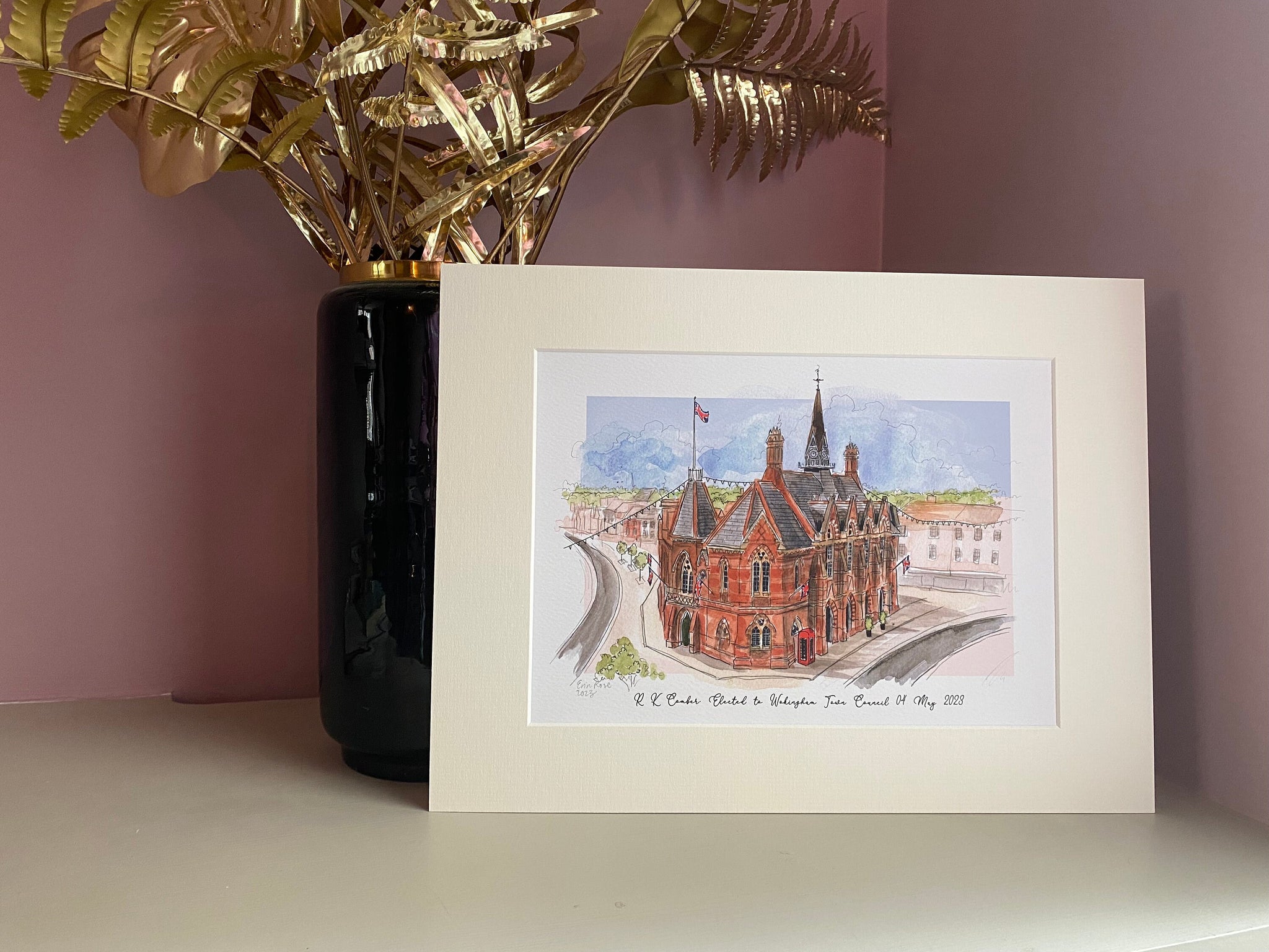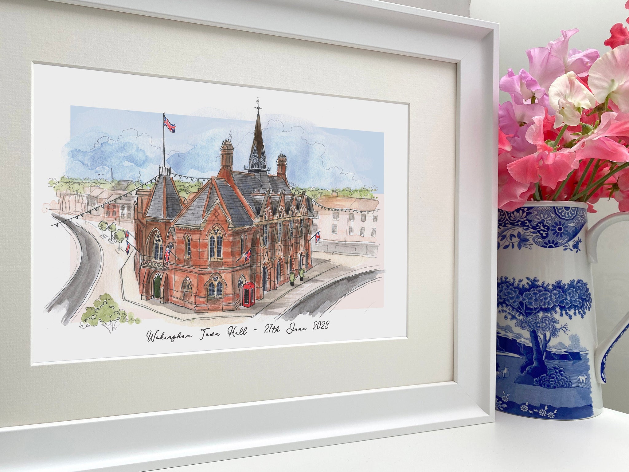 A high-quality print of the beautiful Wokingham Town Hall (England) created from an original hand-drawn Watercolour illustration.