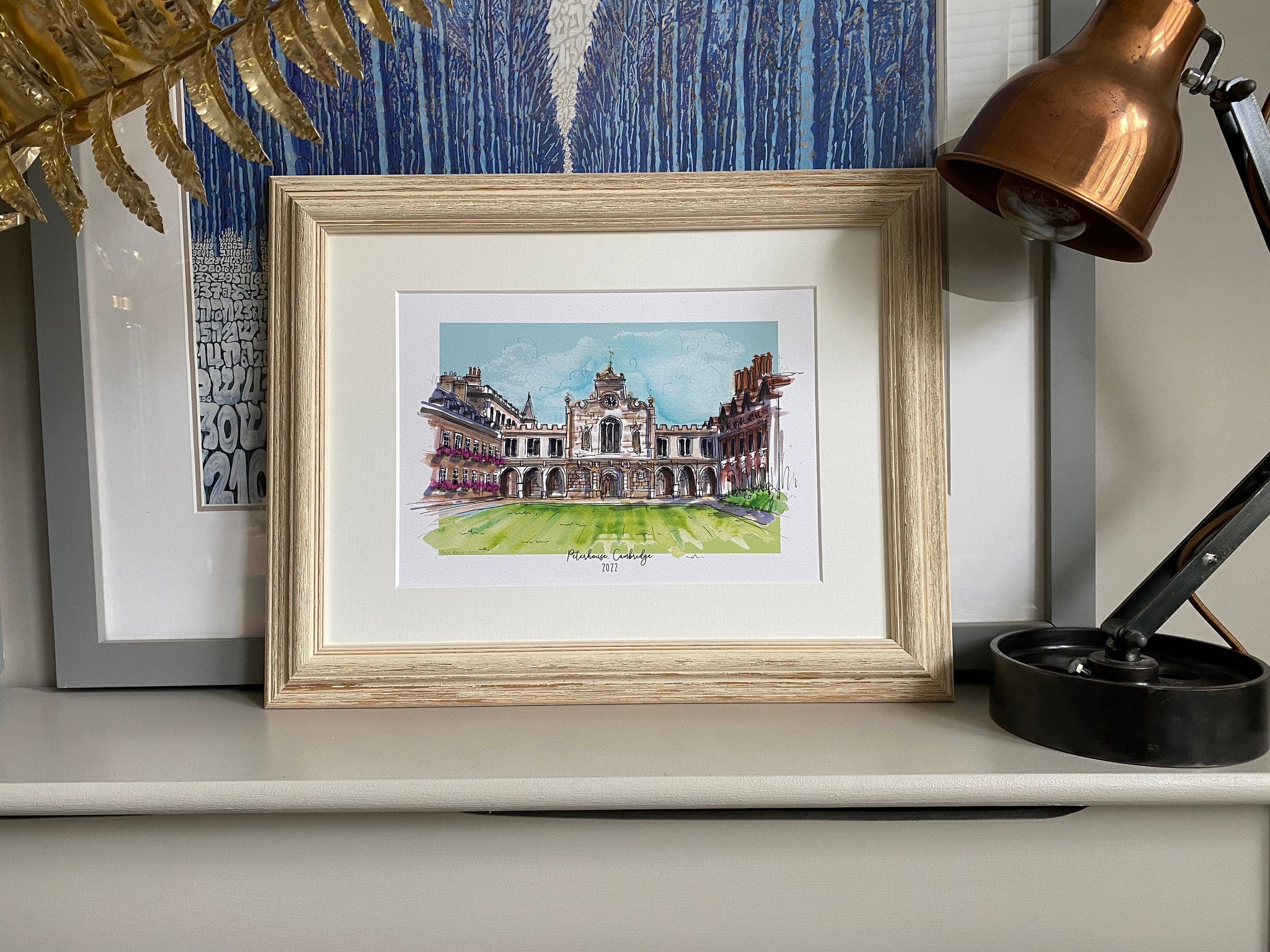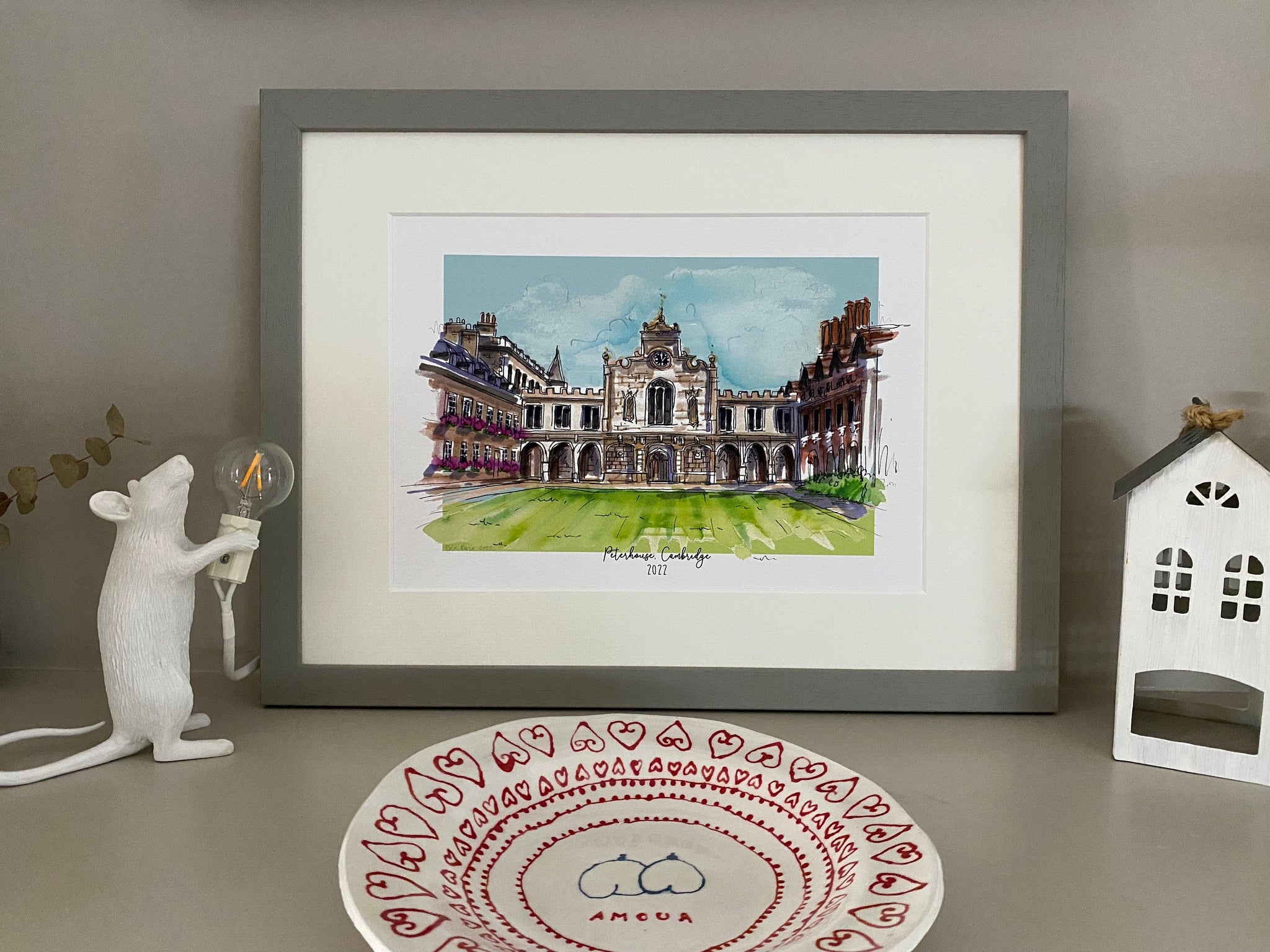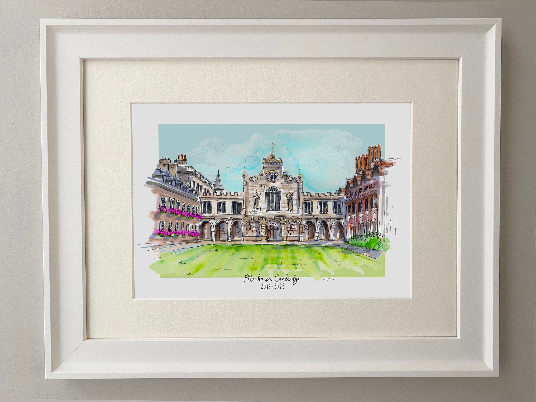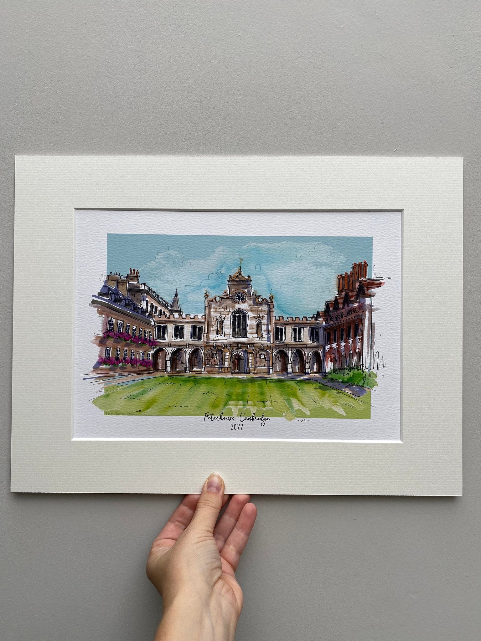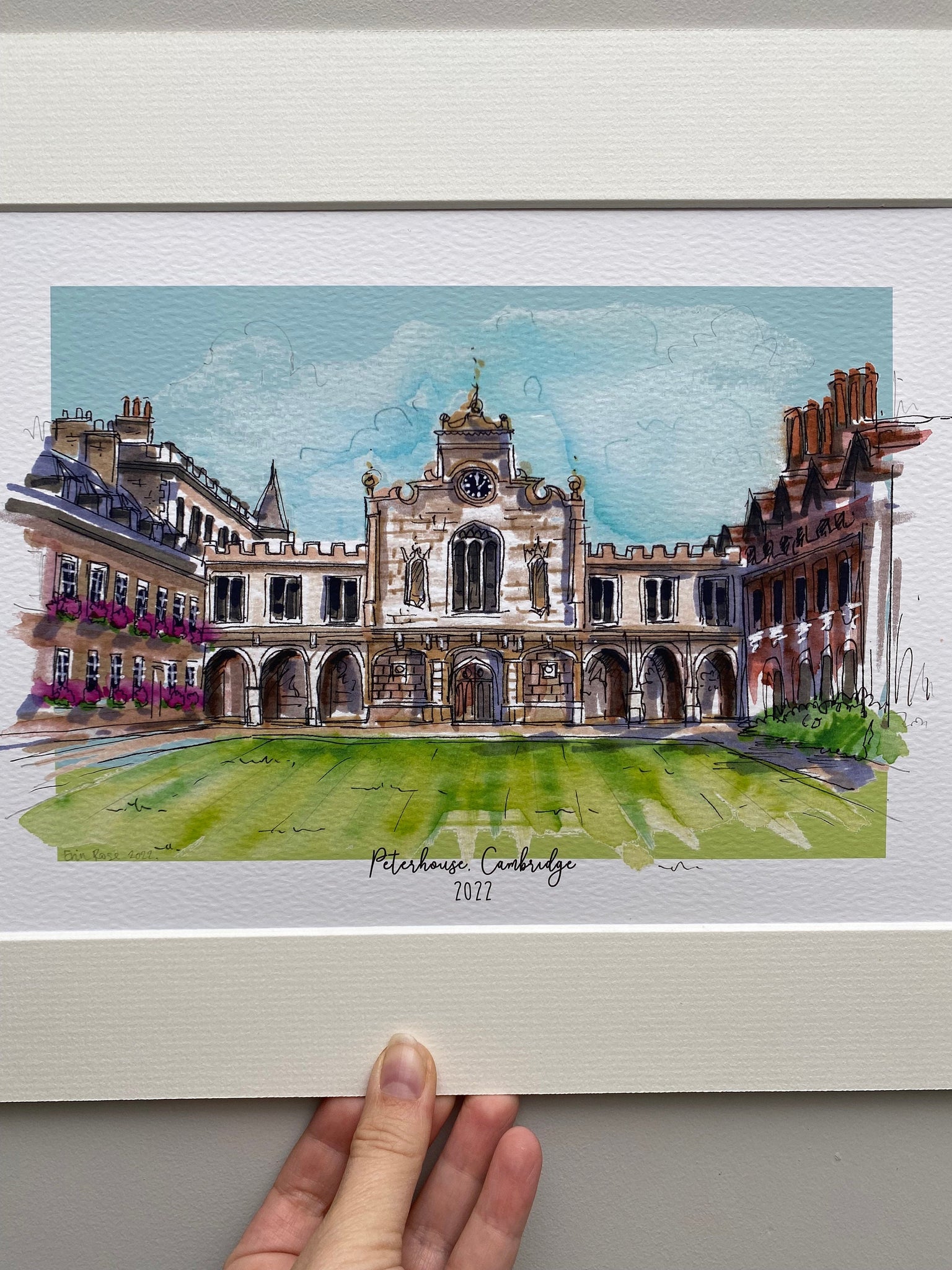 This illustration of Peterhouse, Cambridge University, England, was lovingly hand drawn and painted with inks and watercolours, then made into a high quality Giclee print. Perfect to celebrate a recent Graduation, or anyone who holds a special place in their heart for this beautiful College.
