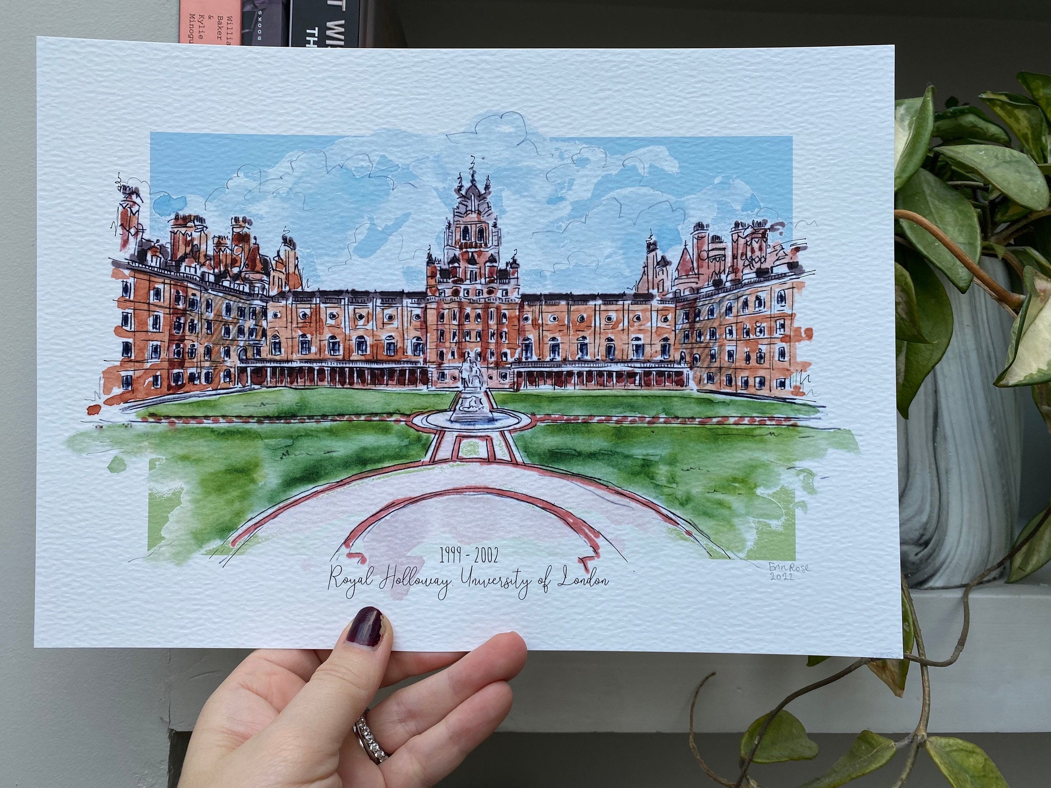 A high-quality print of the beautiful Royal Holloway University of London (England) created from an original hand-drawn watercolour illustration.