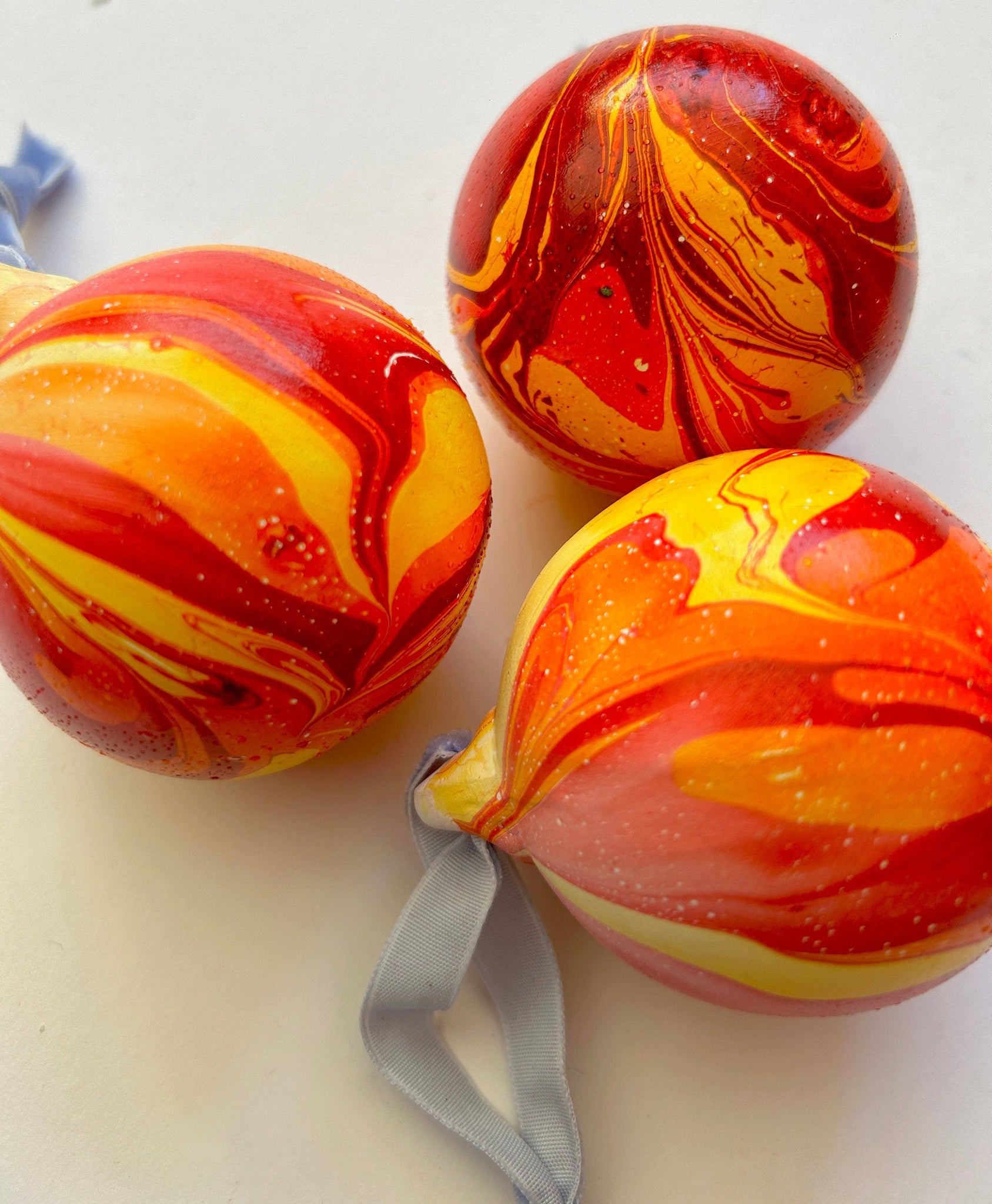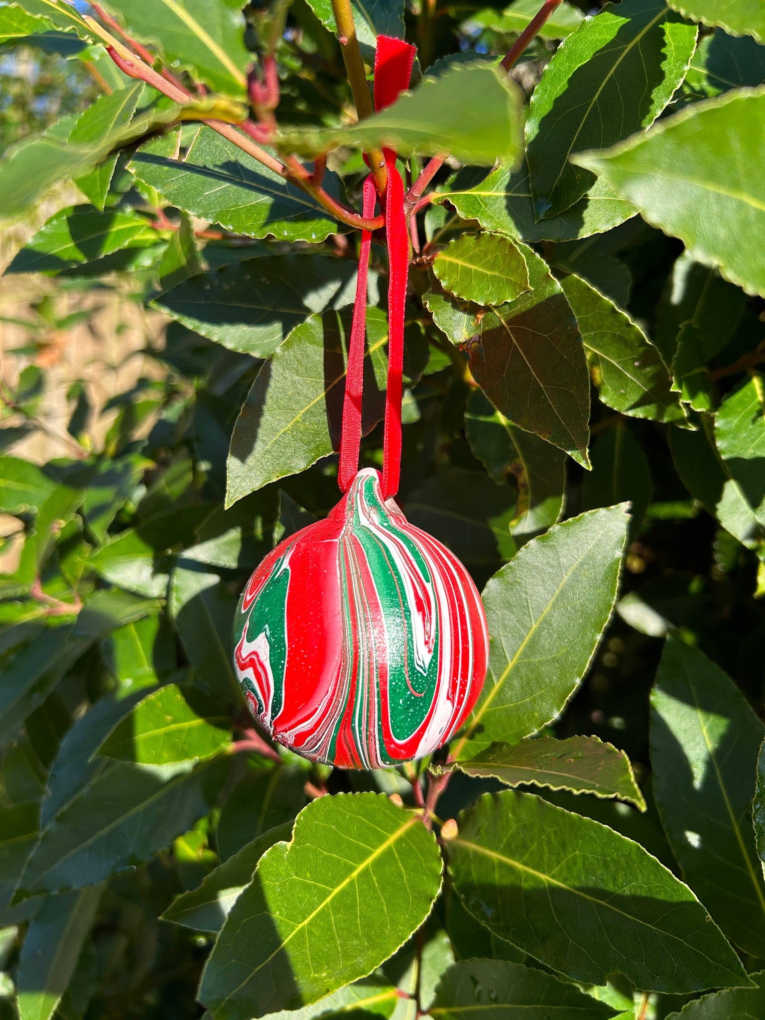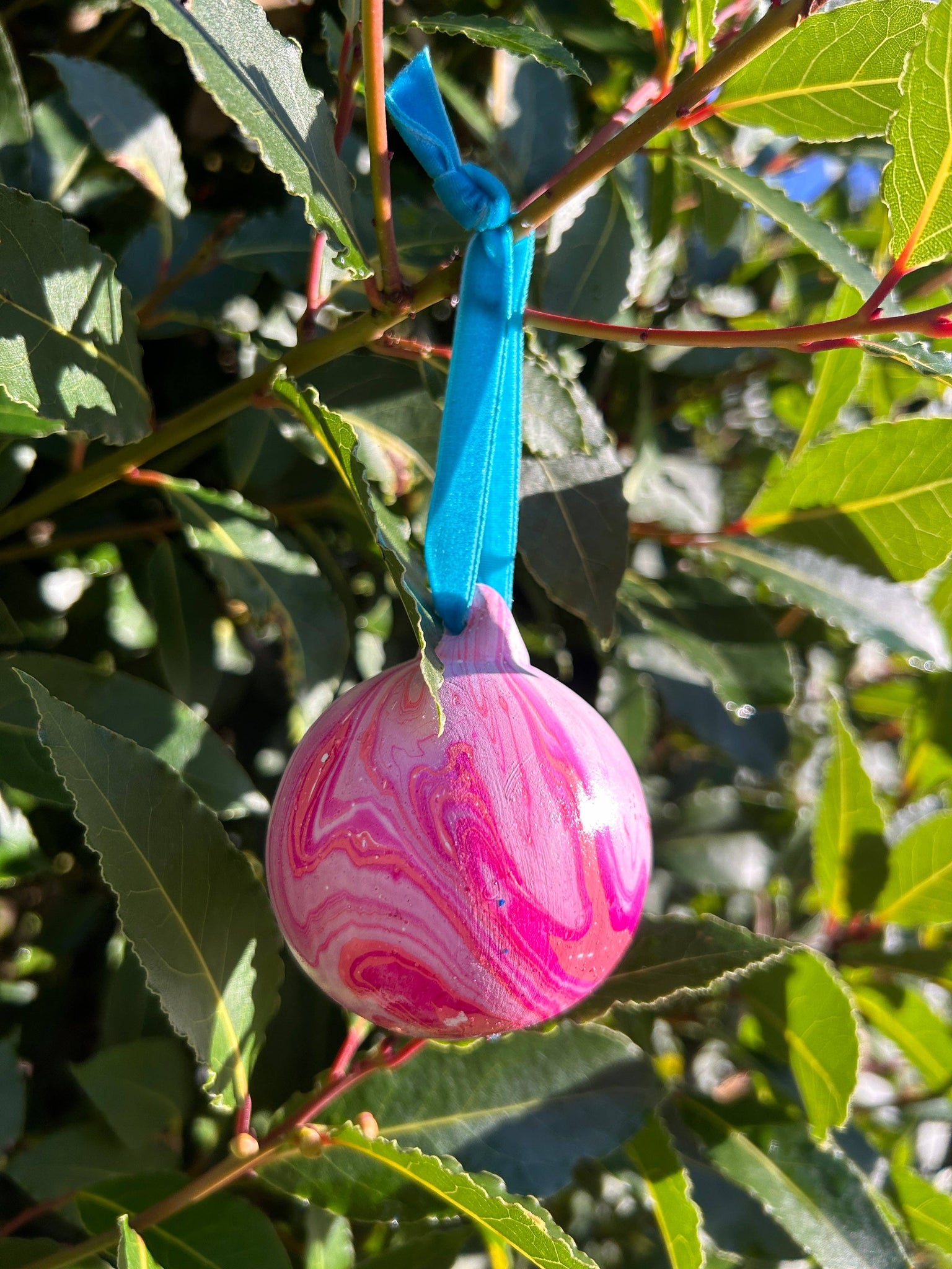 Hand marbled ceramic baubles in a riot of colour to add a little flair to your tree this year. Hung with a vibrantly coloured velvet ribbon. Baubles measure 6cm and come packaged in an individual box perfect for gifting.