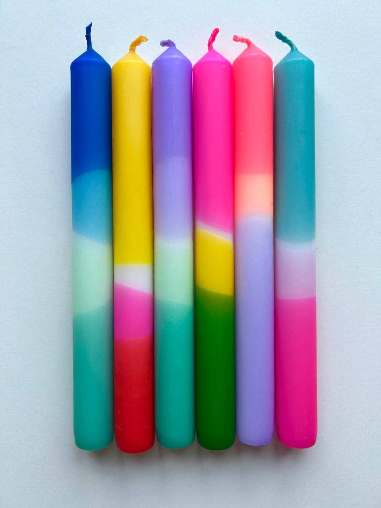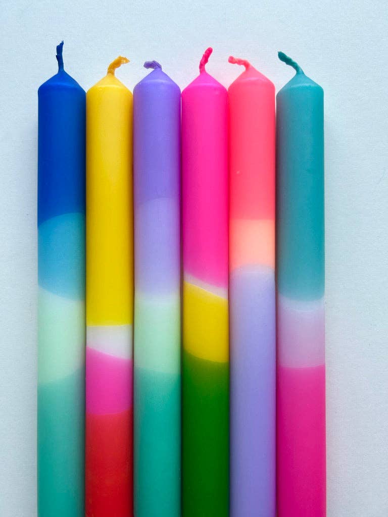 Each of the candles is hand dipped in the Surrey Hills and every set is unique - the bright colour combination is always the same but the pattern may vary ever so slightly.