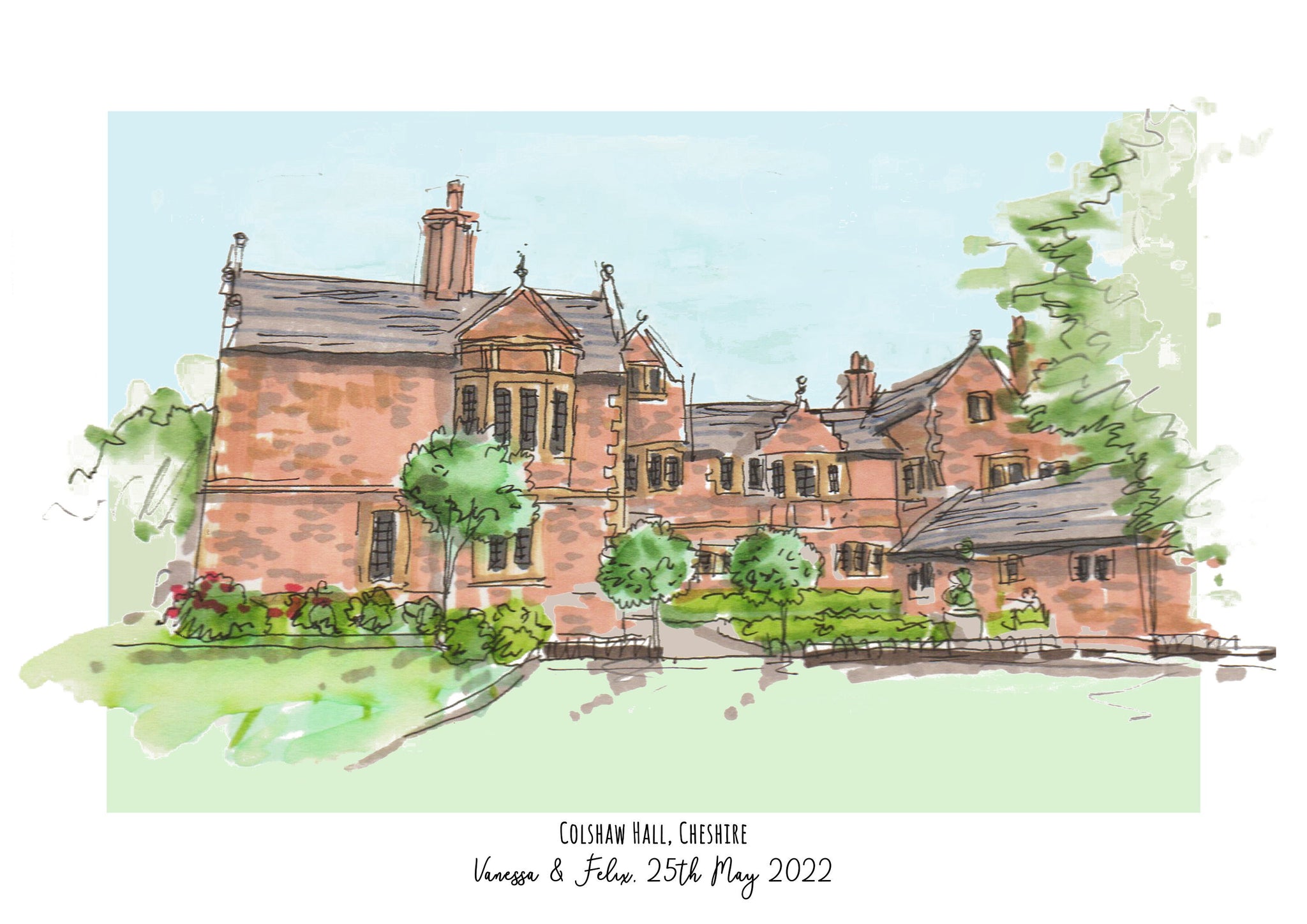 A gorgeous quality print which has been created from an original hand-drawn illustration of Colshaw Hall, Cheshire, England, using watercolours and inks.
