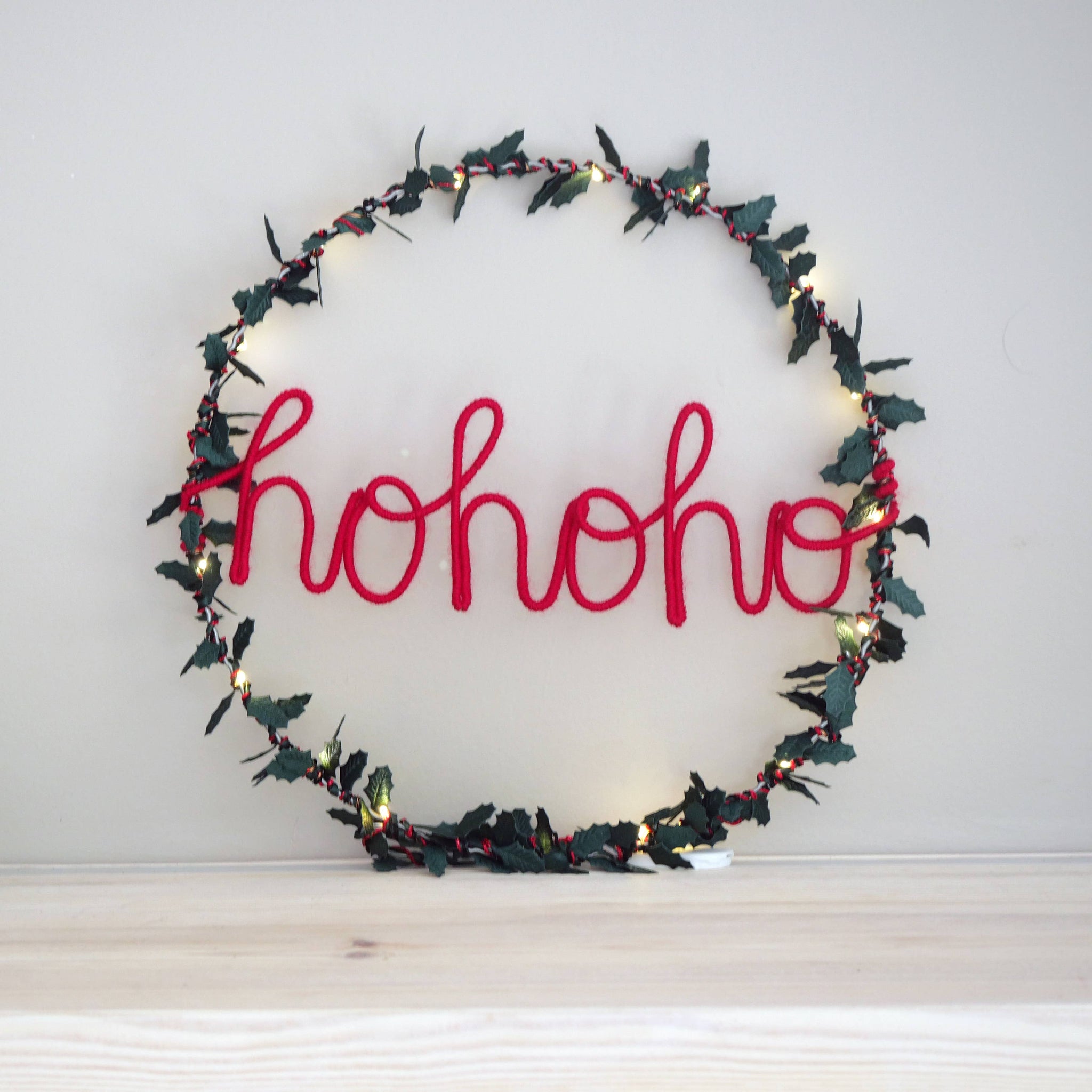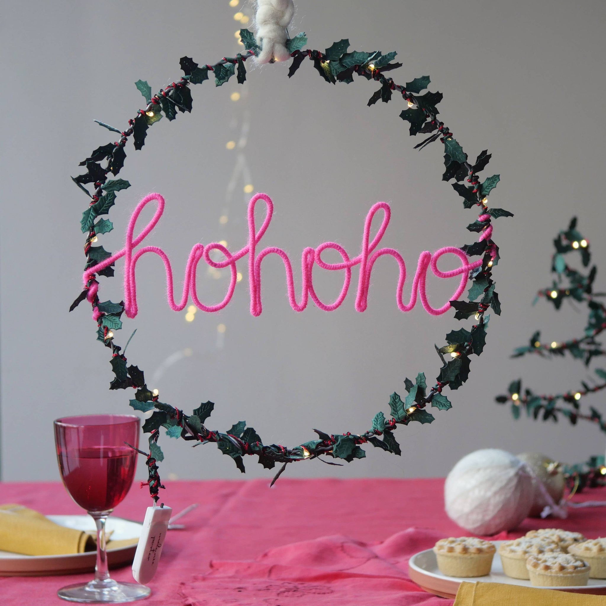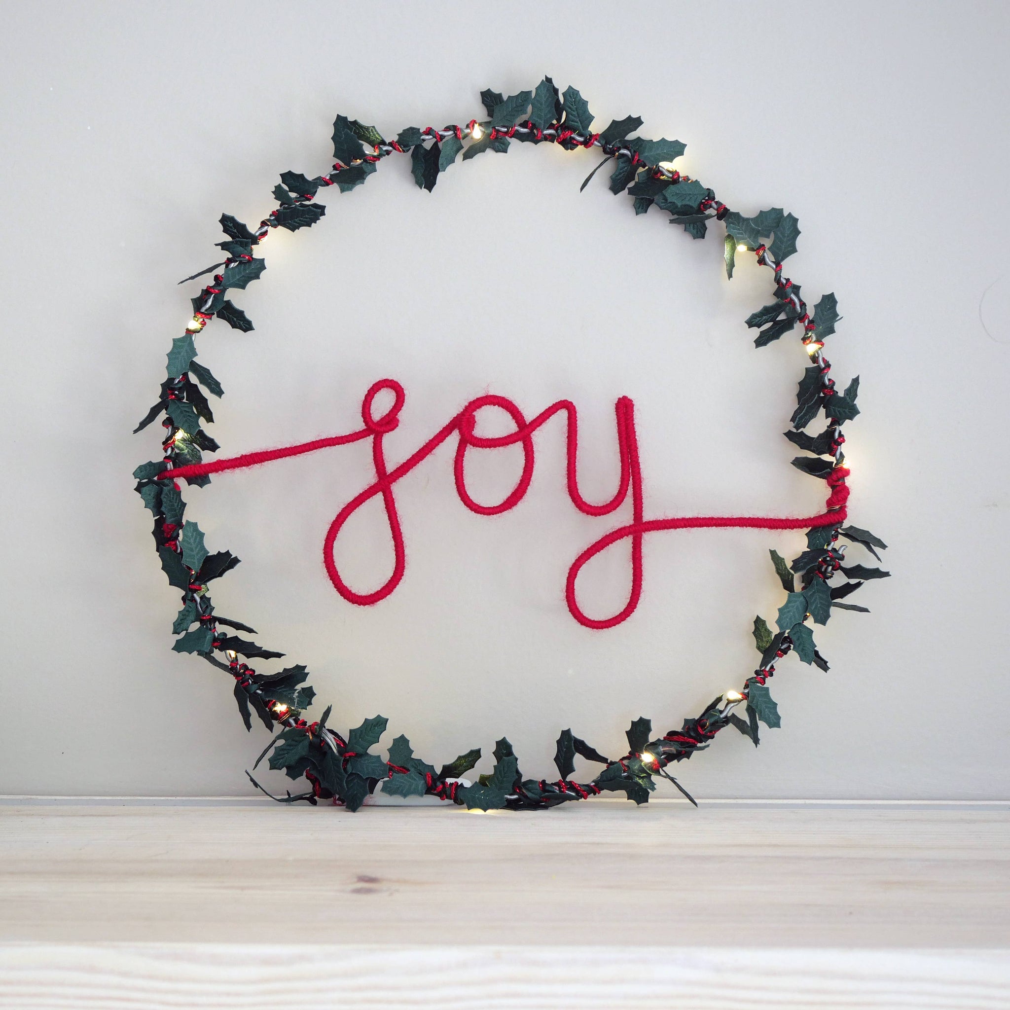 Bring a bold and cheerful statement to your festive décor with our Holly Light Up Wreath. Choose from six festive slogans - Joy, Happy Holidays, Tis The Season, Ho Ho Ho, Fa La La and Deck the Halls. Available in three wire writing colours wrapped in soft yarn, framed in a circular garland of holly leaves hand-spun with warm white LED lights for a soft seasonal glow.