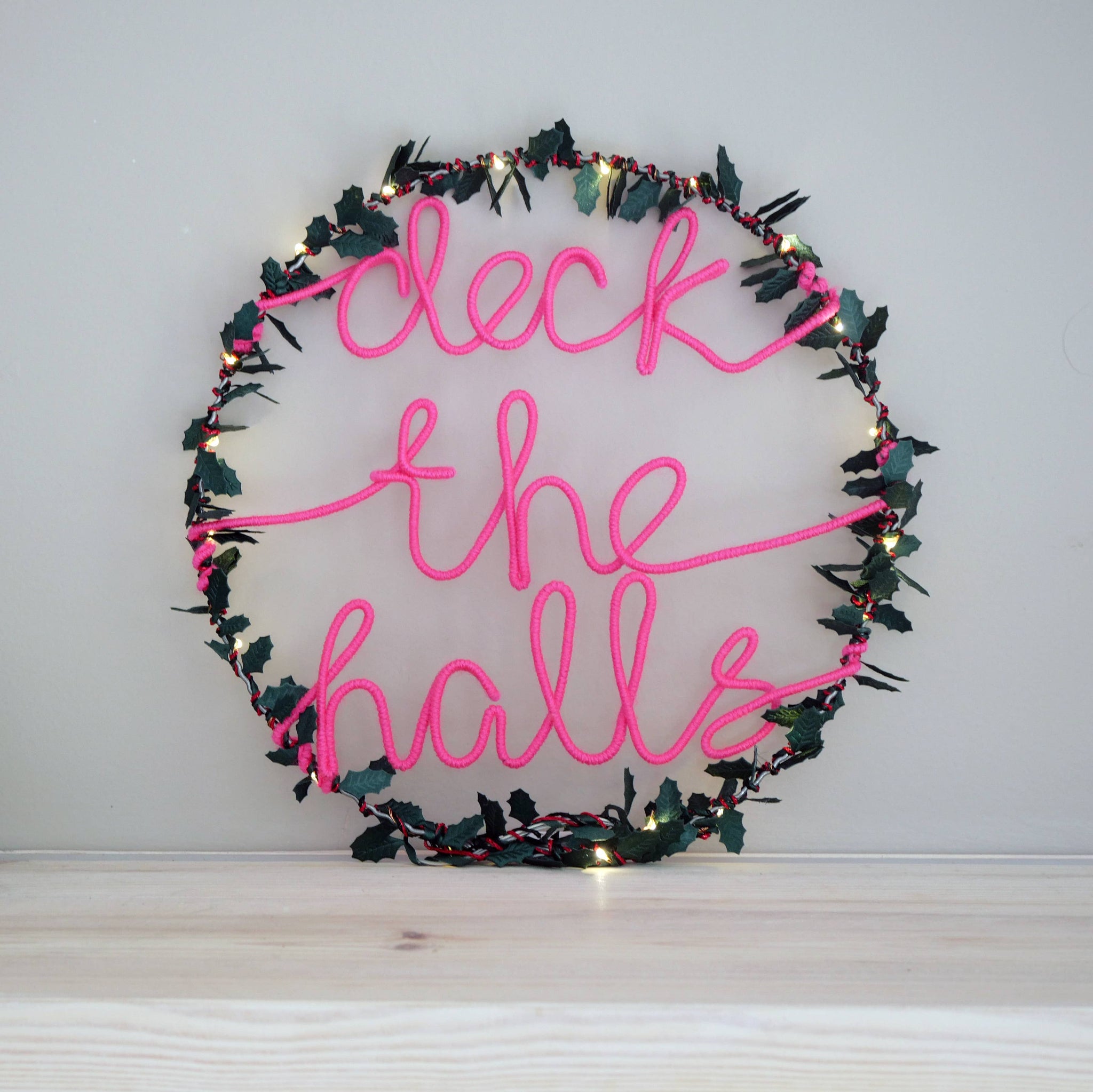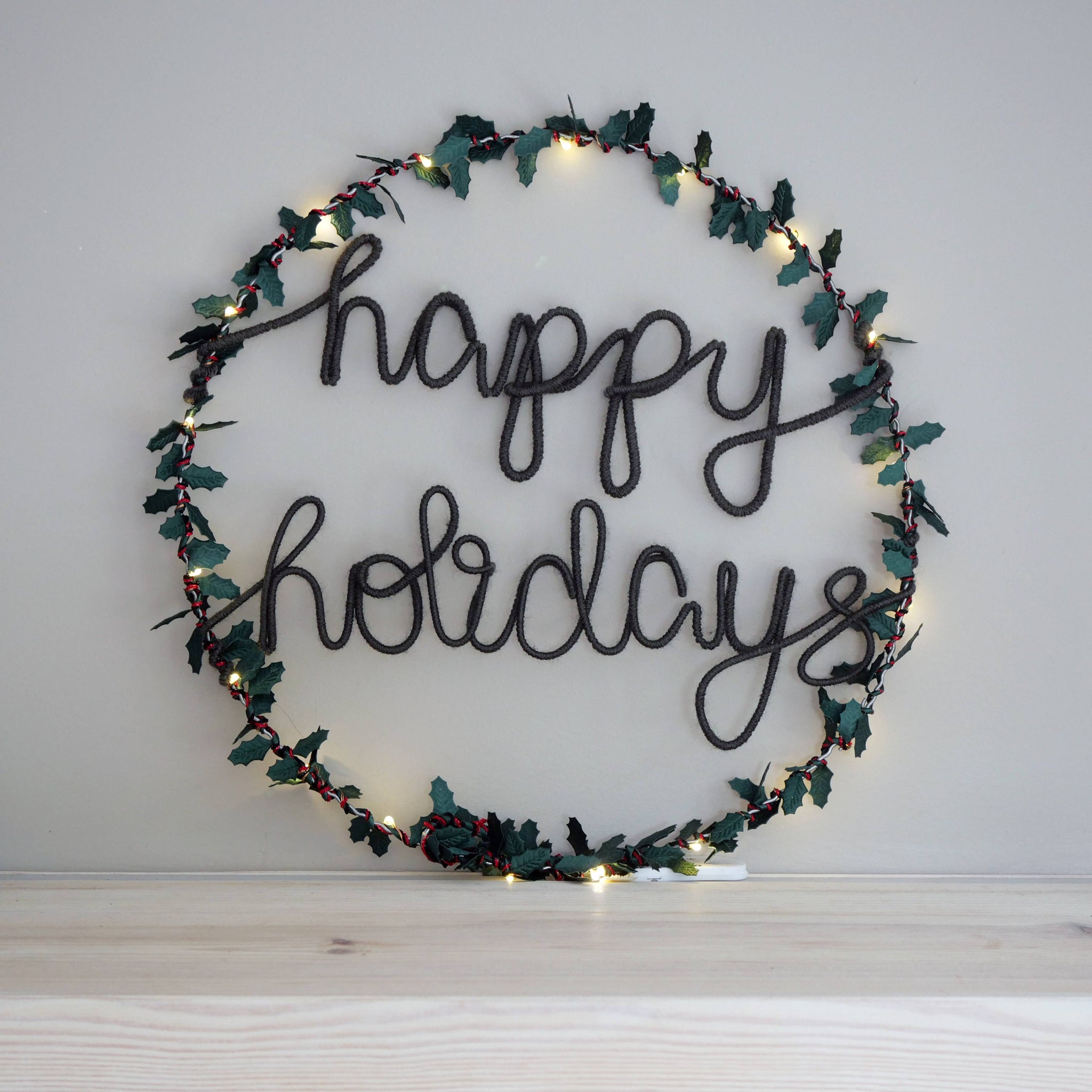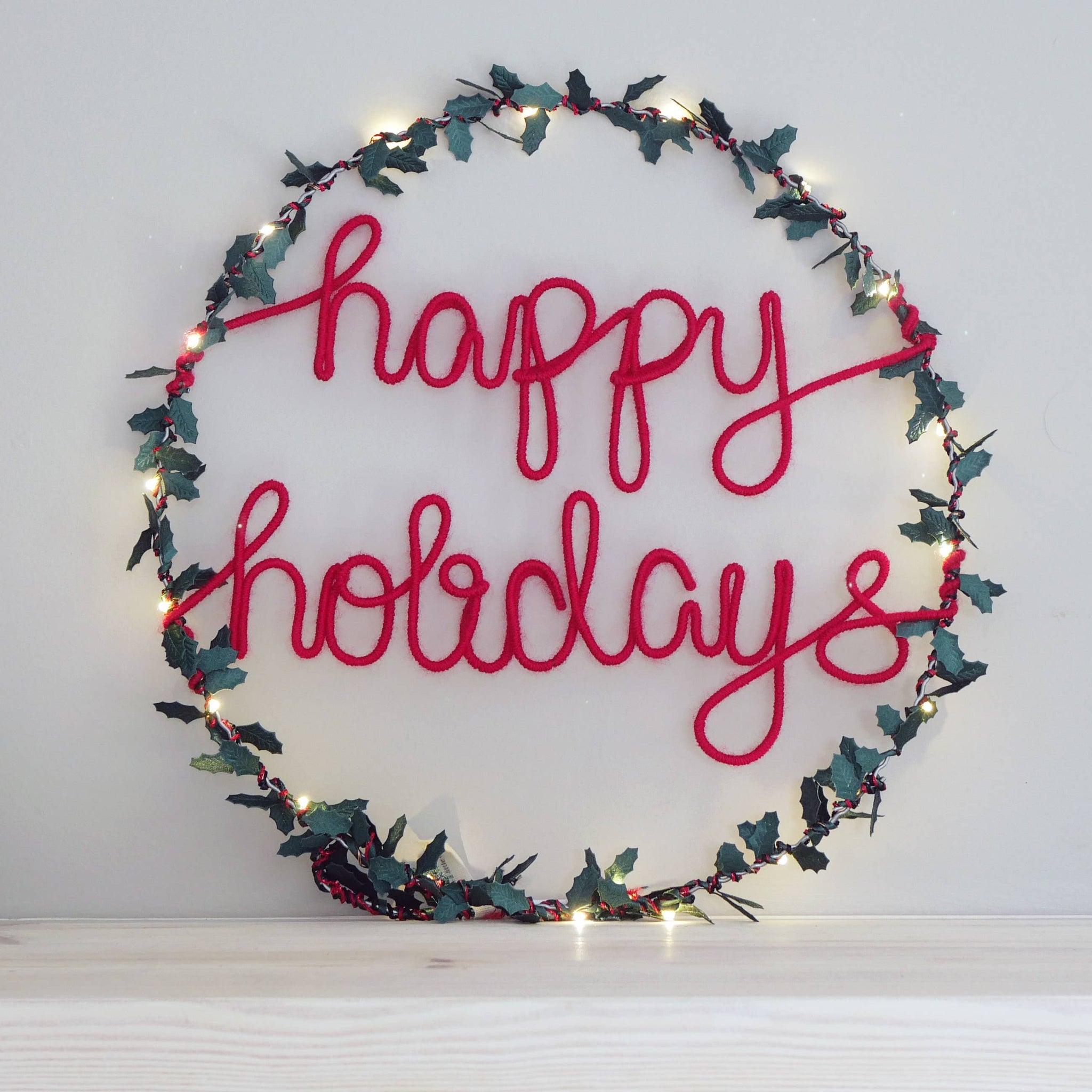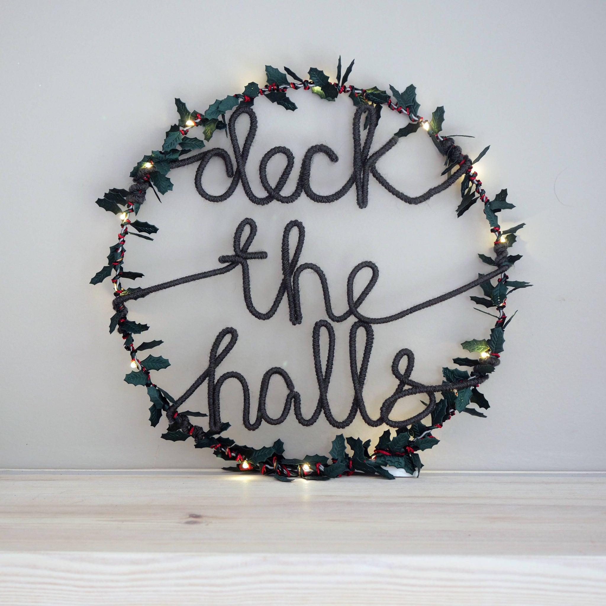 Bring a bold and cheerful statement to your festive décor with our Holly Light Up Wreath. Choose from six festive slogans - Joy, Happy Holidays, Tis The Season, Ho Ho Ho, Fa La La and Deck the Halls. Available in three wire writing colours wrapped in soft yarn, framed in a circular garland of holly leaves hand-spun with warm white LED lights for a soft seasonal glow.
