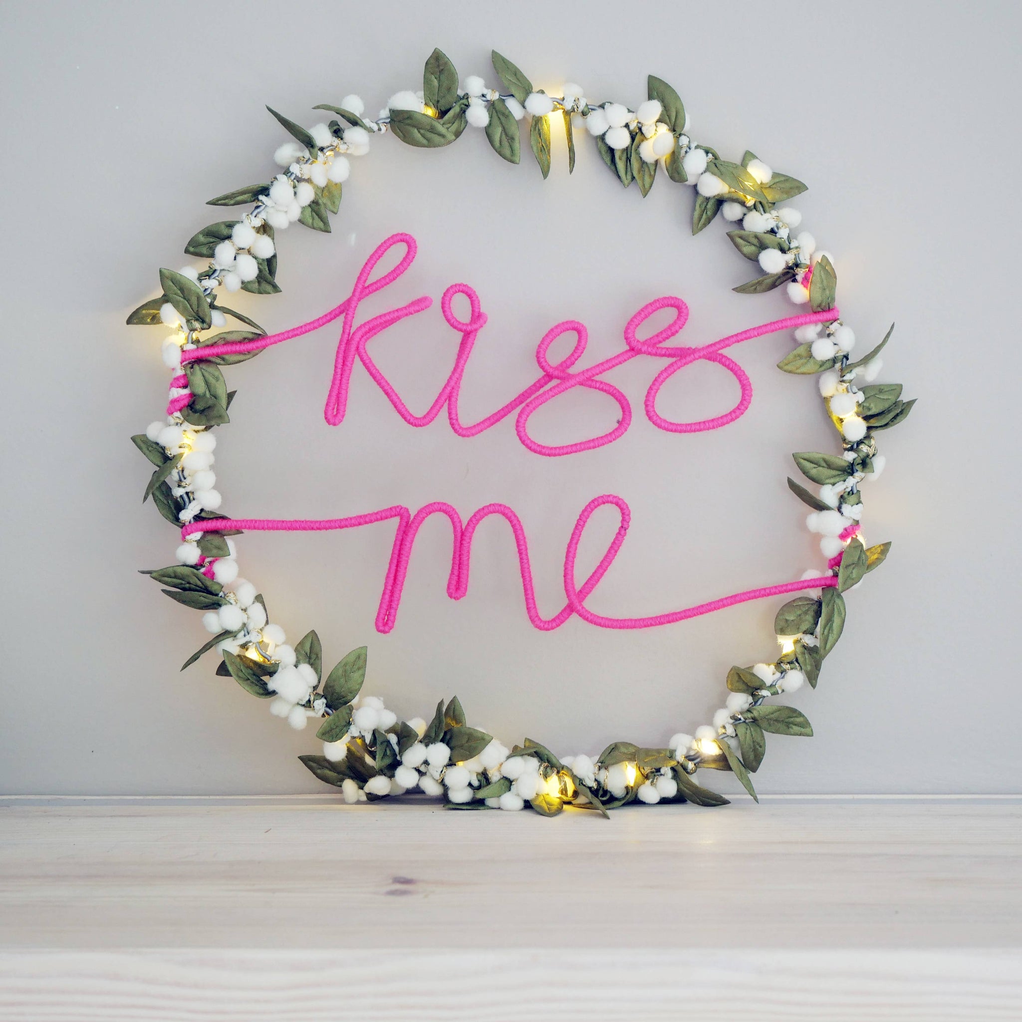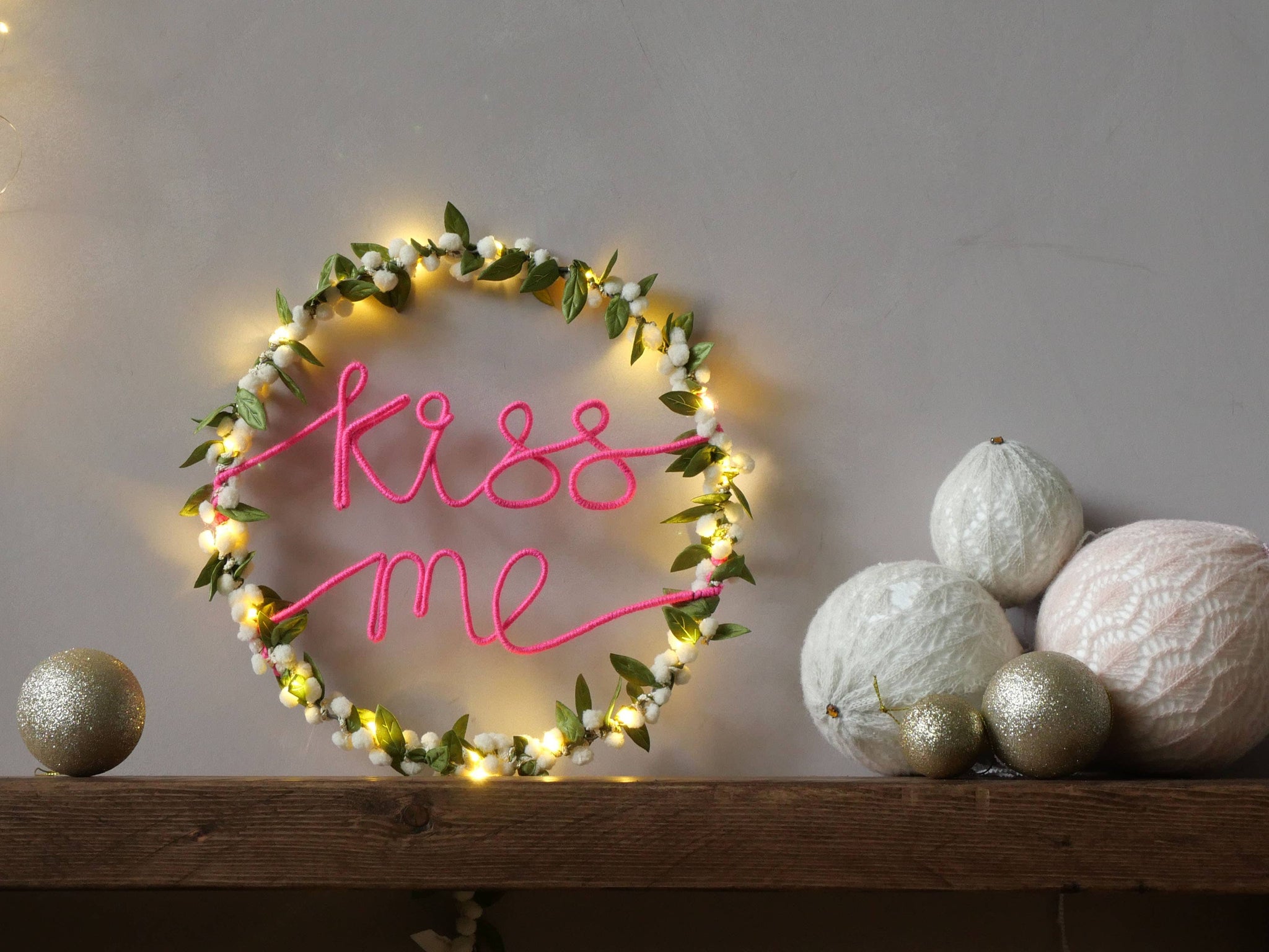 Add a playful and fun twist to your festive decorations with our Mistletoe Light Up Wreath. Fluffy white pom poms and delicate green leaves are hand-spun with warm white LEDs and wrapped around a metal frame. A choice of slogan - 'Kiss Me' or 'Ding Dong' - is hand-finished in neon pink. A lovely fun sign for wall, window or mantle. Co-ordinate with our Mistletoe Lights Collection.