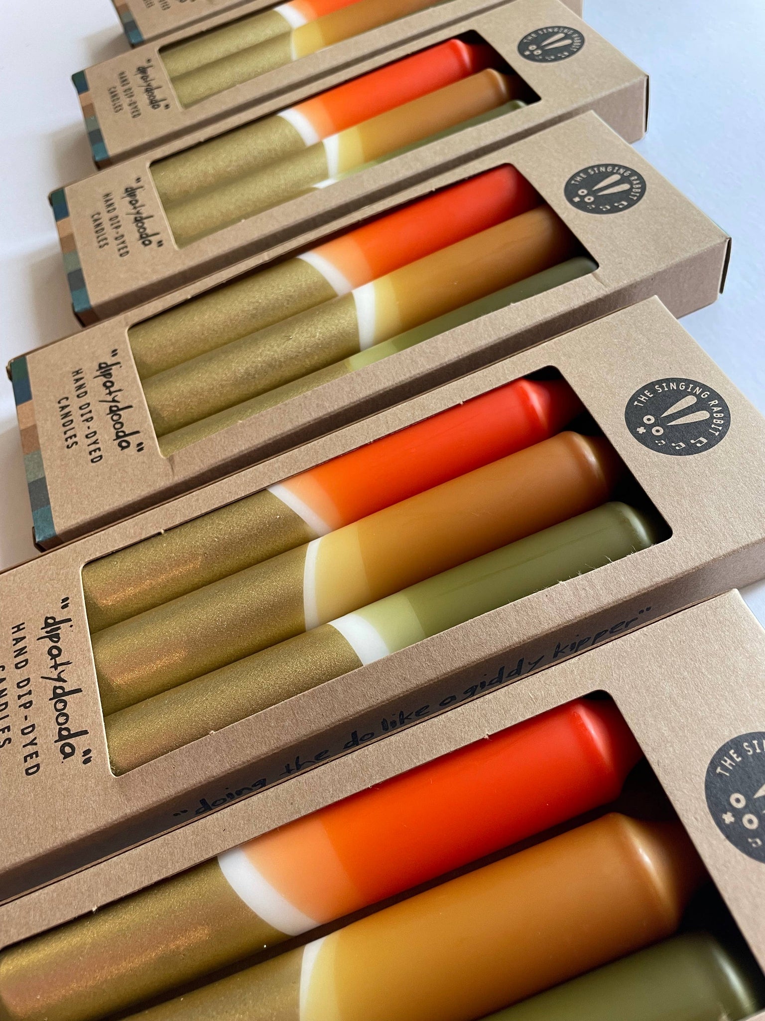 This set of 3 candles is not just for burning - add some fun and a pop of colour to a mantelpiece or table. Their striking design will be a bold, stylish addition to any home or a perfect gift for someone you care about. You can never have too many candles! Lovingly hand dipped, each candle is unique and no two will be identical. Made with 100% stearin, they are non toxic and fragrance free and will provide a long, clean and even burn lasting 7 hours. Candle care: - Never leave a burning candle unattended - Do not burn near children or pets - Take care to burn candle away from draughts and sources of heat - Trim the wick after each use to about 0.5cm Measurements: - Length 20cm - Diameter 2cm - Burn time 7 hours Each set of 3 comes boxed in branded The Singing Rabbit packaging. Great for an eye catching display in your store. Hand dip dyed original candles, taper candles, set of brightly coloured candlesticks, olive dinner candles, stocking filler, xmas gift, Christmas decor