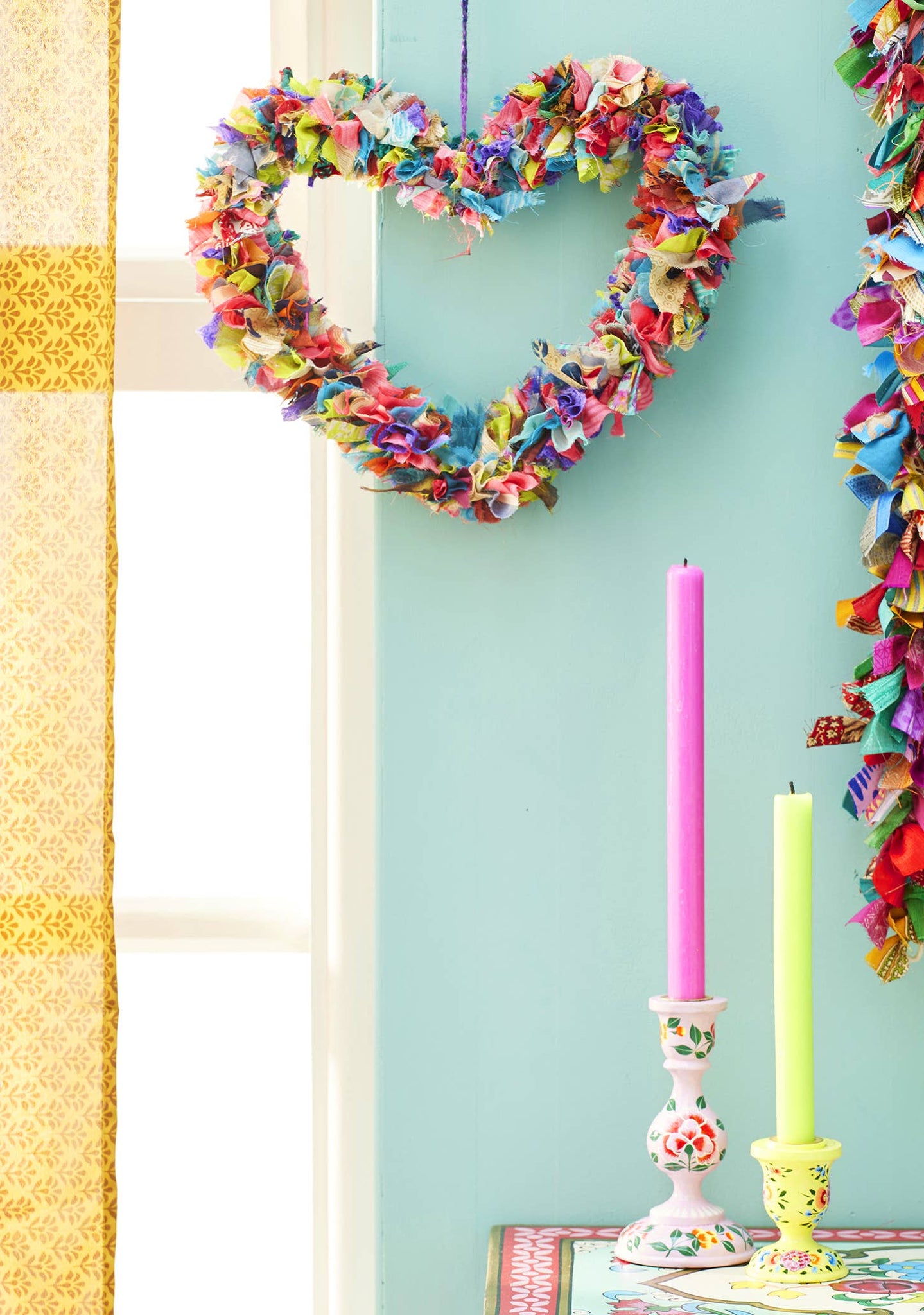 This fancy fabric heart wreath is hand crafted from a mixture of offcuts with deep colour flashes and textured finish combining to give a homely feel. Fitted with a recycled hanging loop. Create an inviting atmosphere with more from this selection of sustainable decoration ideas by Namaste made from richly coloured recycled sari. \r\n \r\n Designs & colours are assorted.