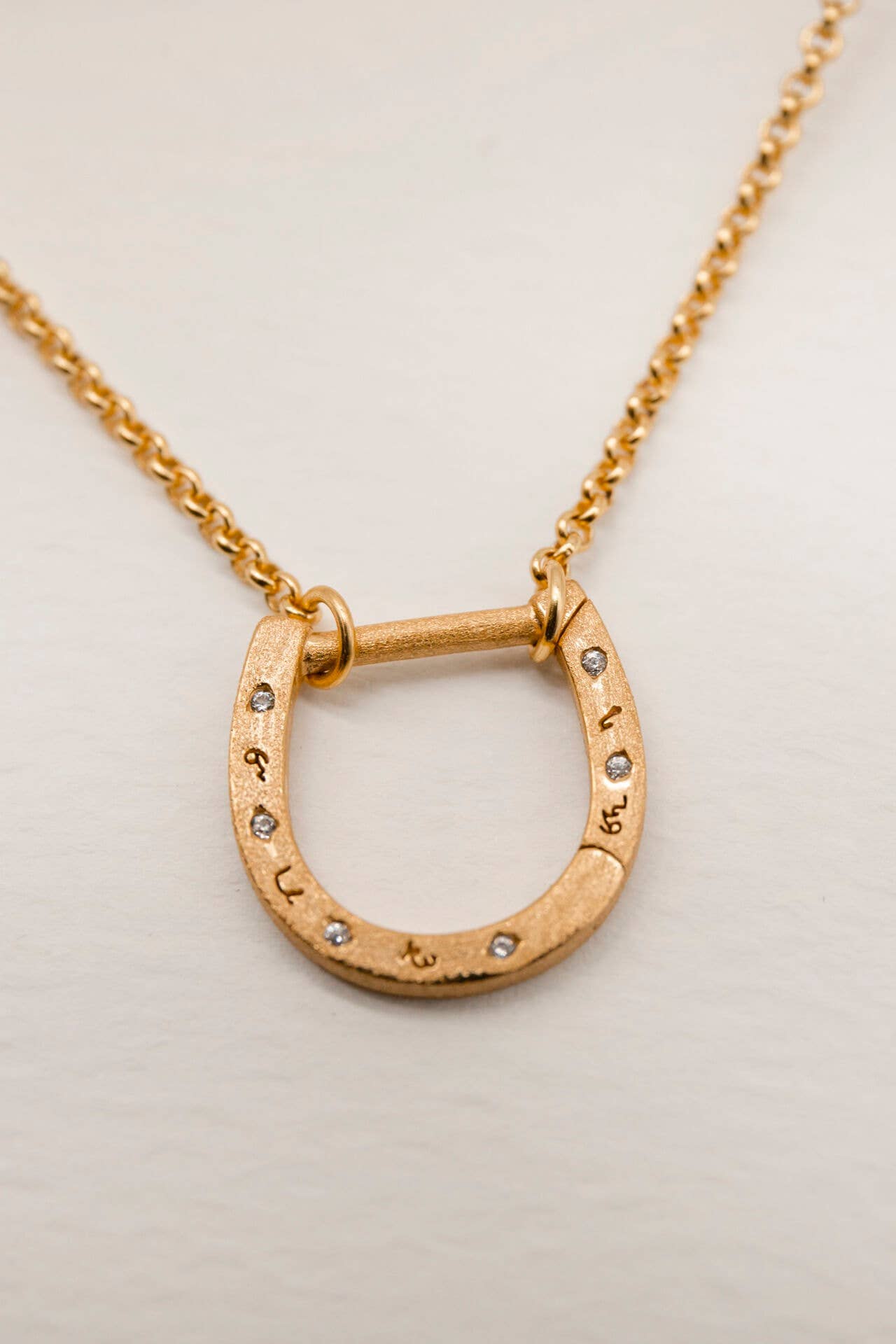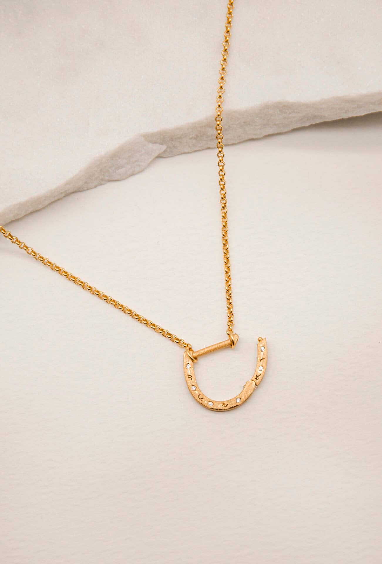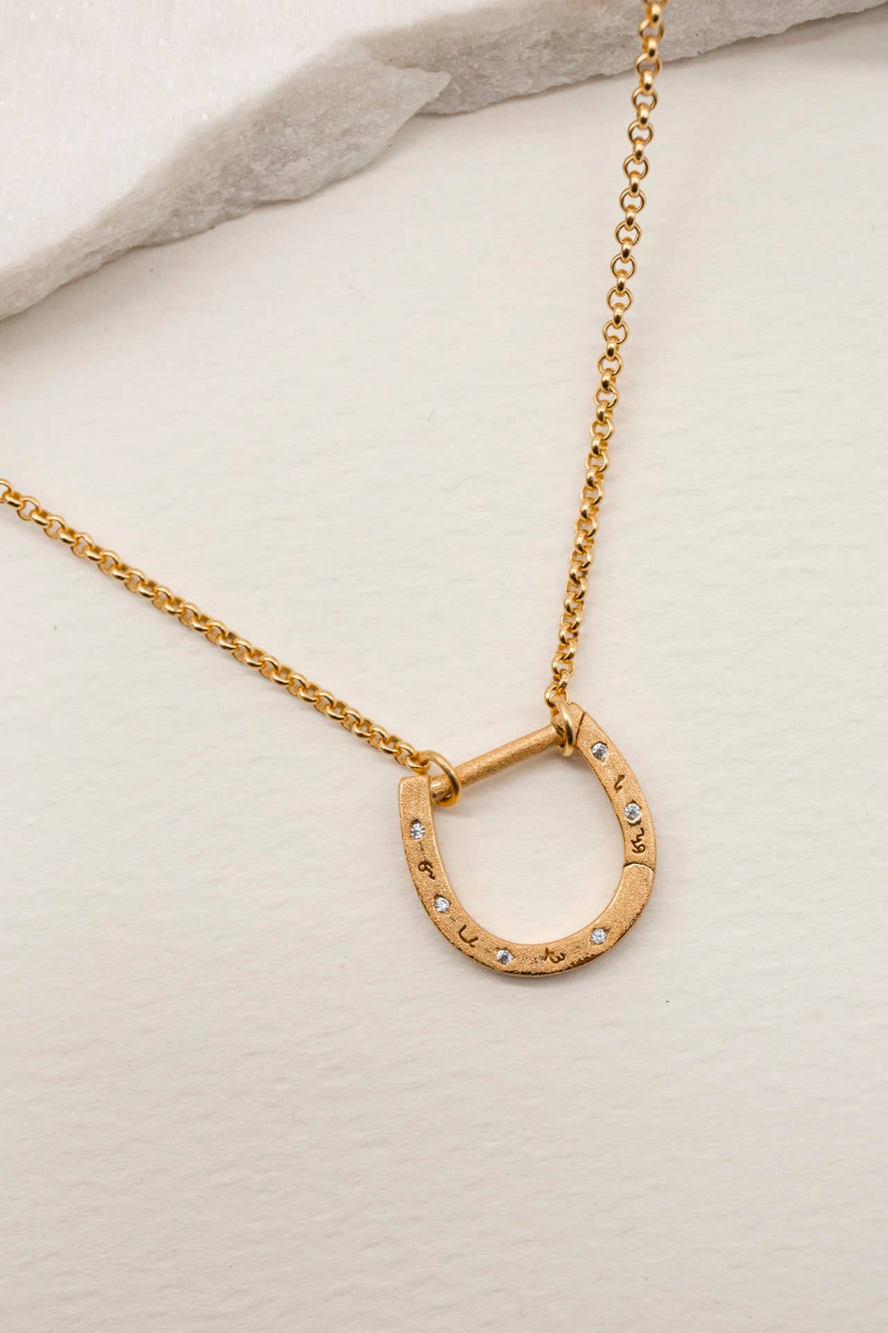 Make your jewellery meaningful, striking and versatile. This good luck horseshoe charm necklace is engraved with Claire's Shorthand meaning Brave, Powerful, Rebellious, Brilliant and Enough and scattered with organic cubic zirconia. Part of the Oracle Collection taking inspiration from history, nature and the written word to create meaningful talismans to tell your story. The pendant opens to slip the chain on and clasps into place. Wear solo or hang on your favourite charms to make a personalised piece just for you. Product Details: Materials: Responsibly handcrafted from a solid base of 100% recycled 925 silver and plated with 18k recycled gold vermeil. 5x thicker than standard gold plating for tarnish-free jewellery you confidently wear every day. Chain: Choose from a rolo chain with measuring 45cm Horseshoe Charm: 15mm x 15mm, Width 2mm, Bar 1.4mm